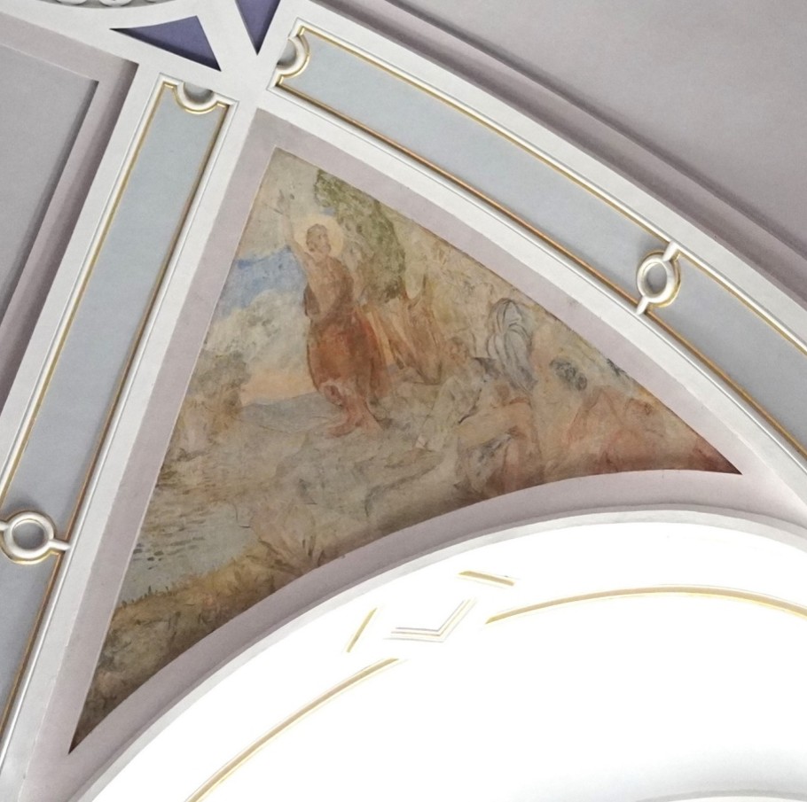 Med obnovitvenimi deli stropa kupole, razdeljene na štiri trikotne pole, so restavratorji leta 1999 v severnem delu kupole odkrili Groharjevo fresko (3) iz leta 1902. Cerkev je naročila poslikavo vseh štirih kupolnih pol z motivi iz življenja sv. Janeza Krstnika, vendar je bil slikar zaradi osebnih težav odslovljen, že naslikana freska pa prebeljena. Restavratorji so z veliko truda in zahtevno tehniko odstranili belež in osvežili barve, tako da zdaj lahko prepoznamo prizor, ki prikazuje Janeza Krstnika kot glasnika, ki pridiga poslušalcem. Kljub figuralnemu prikazu je mogoče razbrati naravo, s sledovi ometa pa deluje skoraj kot prosojen akvarel.