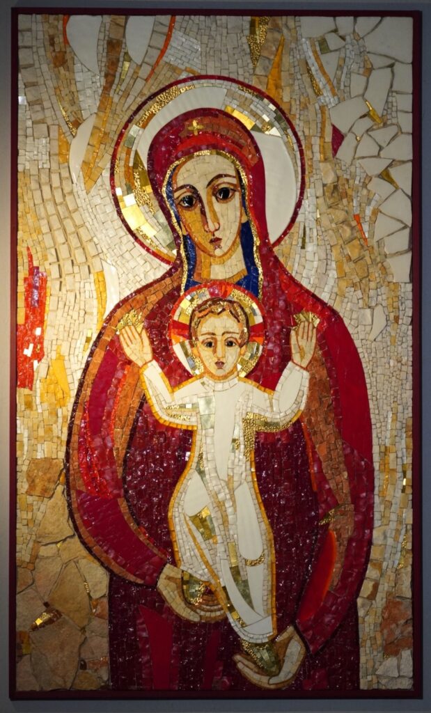 Mozaik Marija Lestev (Marko Ivan Rupnik, 2003) (13) je bil izdelan po Rupnikovi zasnovi v ateljeju za duhovno umetnost v rimskem centru Aletti. Mozaik združuje kamnito reliefno strukturo, živahne barve, simboliko in svetlobo, ki poudarja inkarnat (utelešenje) z materialnim leskom. Prevladujeta rdeča in modra barva. Marija je upodobljena z mirnim, nežnim izrazom in velikimi očmi, ki spominjajo na obraz božjega otroka. Slikar se je oprl na bizantinsko ikonografsko tradicijo, za katero sta značilni stilizacija in shematičnost, obe pa simbolizirata večnost. Marijin lik je jasno izrisan in v svojem širokem obrisu predstavlja masivno, simbolično zavetje Jezusove postave. Dete stoji na materinih dlaneh, kot da prihaja iz nebes po lestvi.