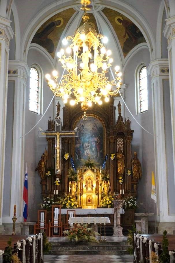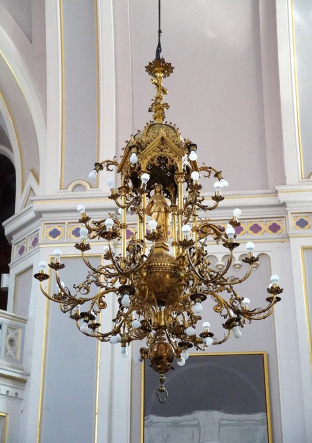 Lestenec, izdelan leta 1901 v livarni Samassa v Ljubljani, je pozlačen in ima številne žarnice.