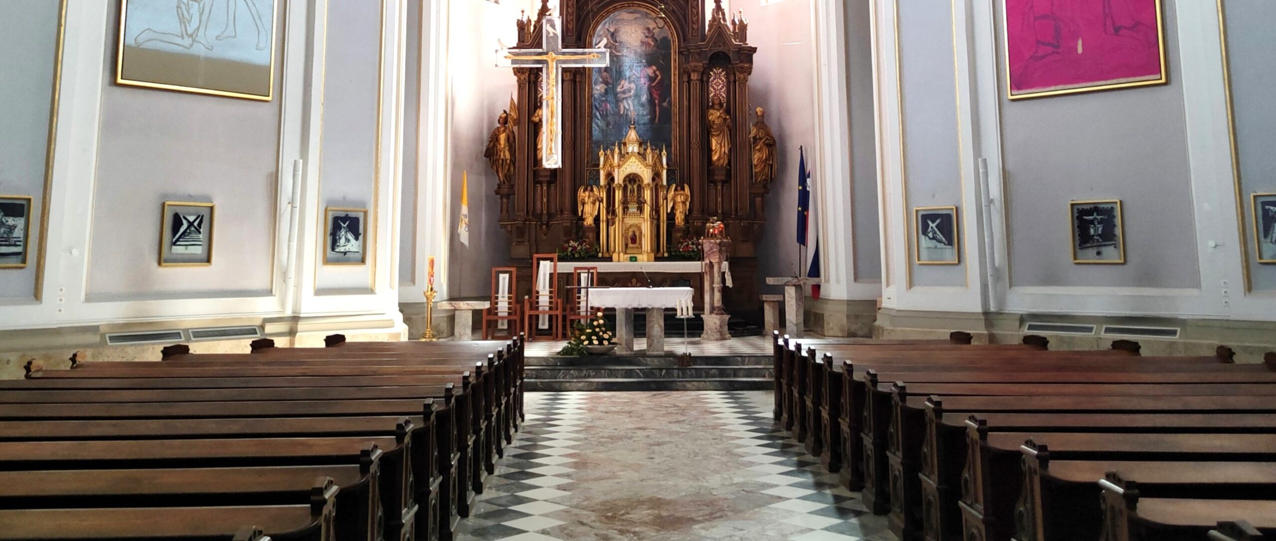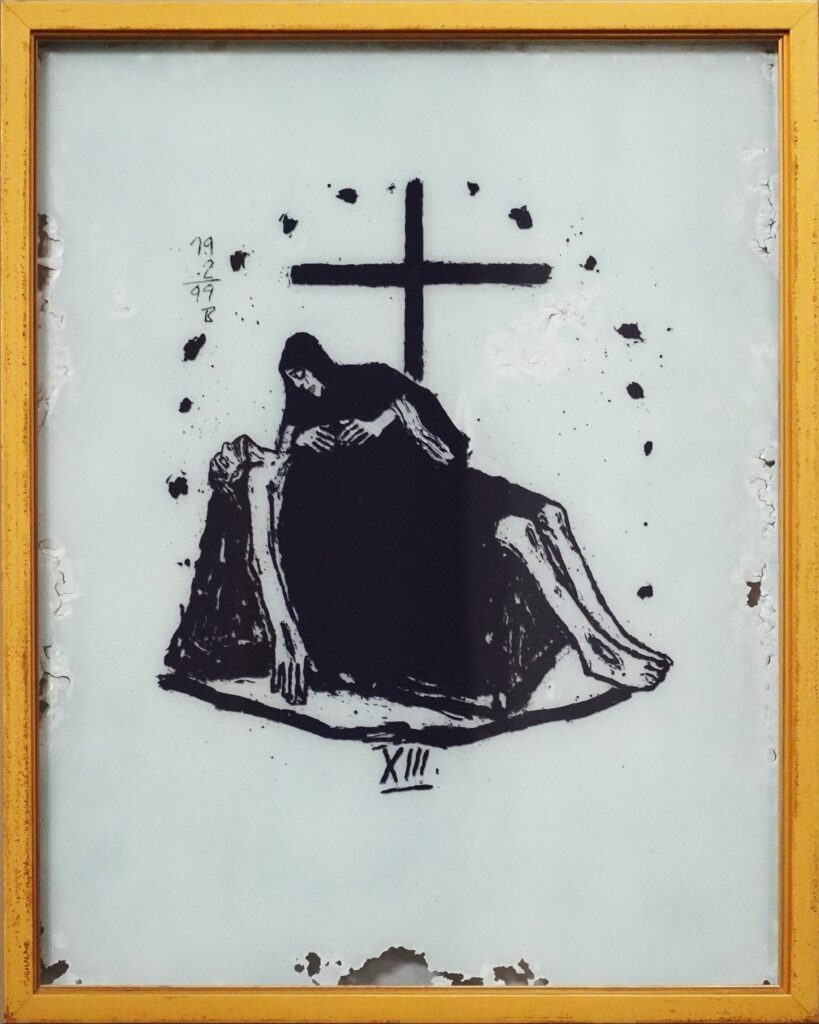 Na levi in desni steni je štirinajst postaj križevega pota (Janez Bernik, 1999), ki so razporejene v krožni liniji od desne proti levi, po sedem postaj na vsaki strani. Prva postaja je ob steklenih vratih na desni steni, postaje se nadaljujejo do treh stopnic pred prezbiterijem in končajo z zadnjo, štirinajsto postajo, ob izhodu na levi steni (8).