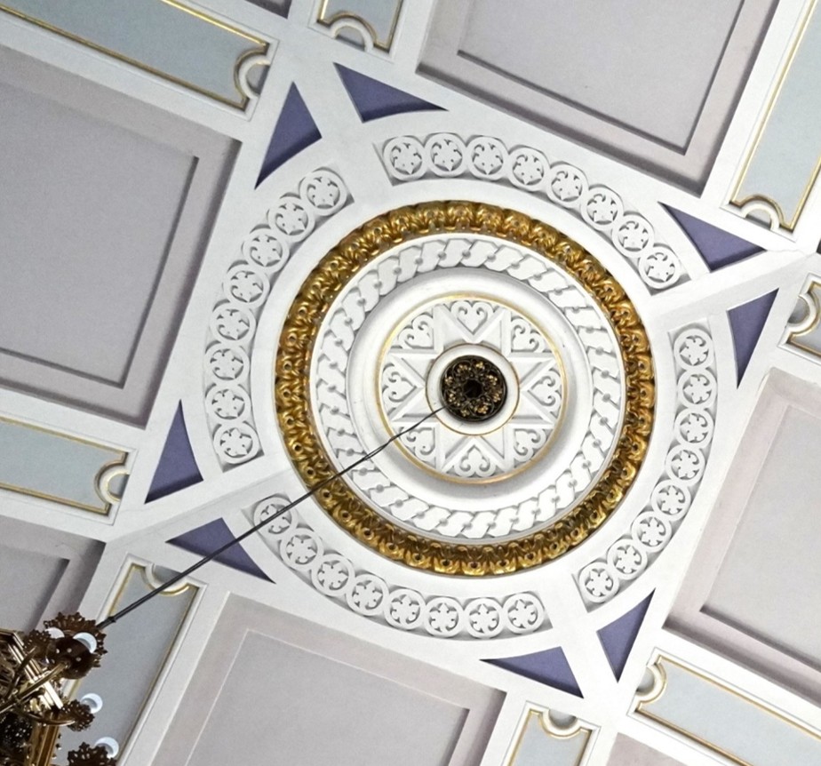 Sredi stropa je obočna štukaturna rozeta, ki kot sklepnik združuje barvne pole. V rozeti razlikujemo sedem krogov, ki so izmenično oblikovani gladko in reliefno. Eden je zlate barve, drugi pa so v belih in rumenih odtenkih.