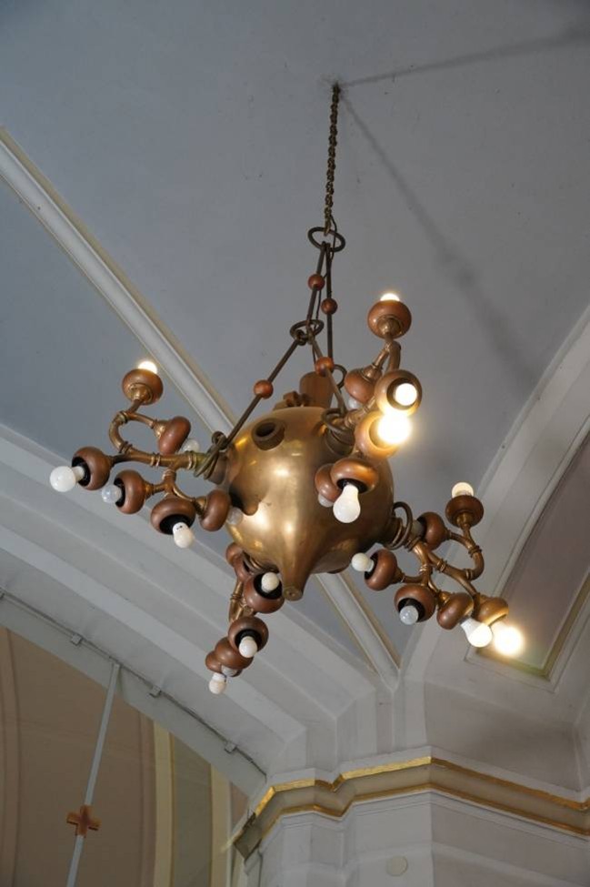 Pri vhodu so štirje minimalistični kropilniki (Jože Motoh, 1999).