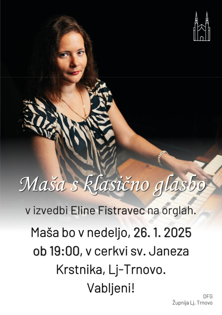 Vabljeni na mašo s klasično glasbo v izvedbi organistke Eline Fistravec. Maša bo v nedeljo, 26. 1. 2025 ob 19.00.