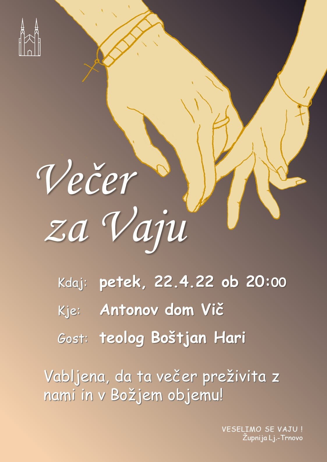 Prisrčno vabljeni pari vseh generacij!Večer za Vaju bo v petek, 22. aprila ob 20. uri v Antonovem domu na Viču. Za prijeten program z besedo…