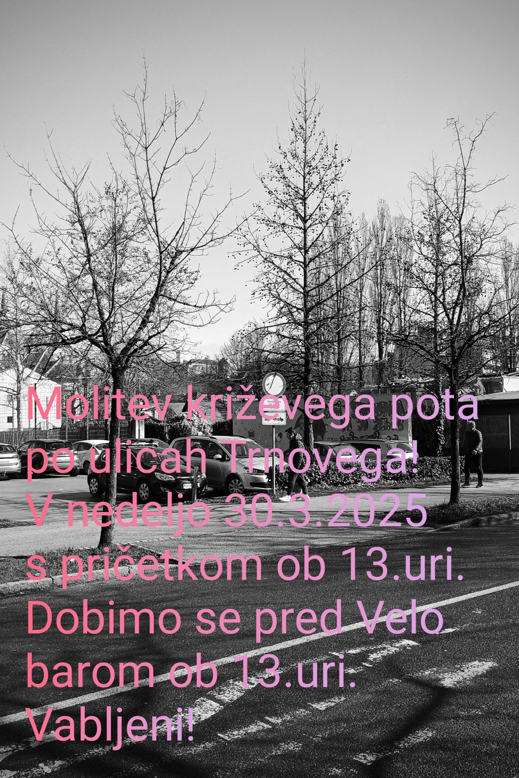 Molitev križevega pota po ulicah Trnovega!Dobimo se v nedeljo, 30. 3. 2025 ob 13. uri, pred Velo barom. Vabljeni!