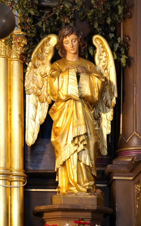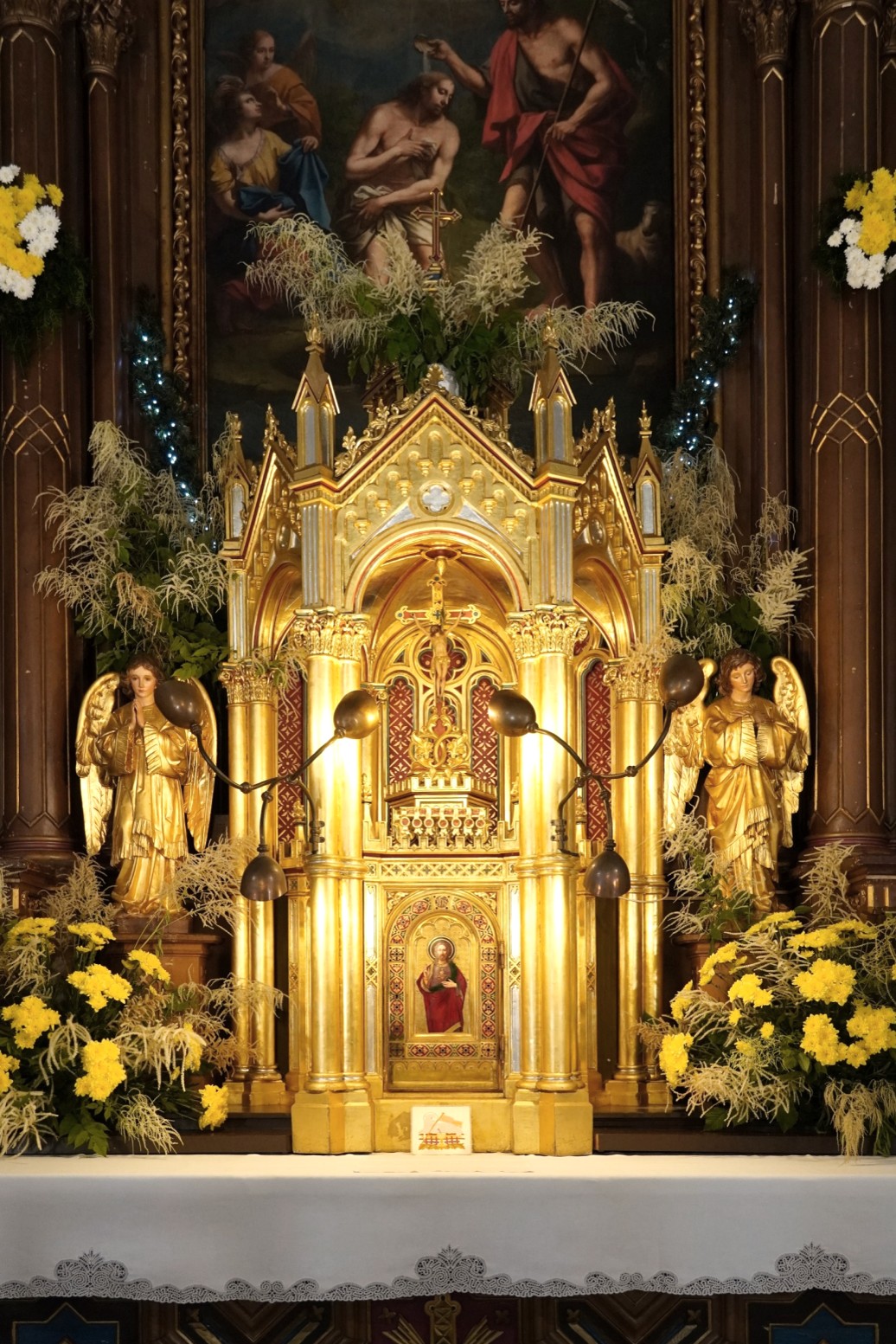 Ob tabernaklju stojita dva pozlačena angela adoranta.