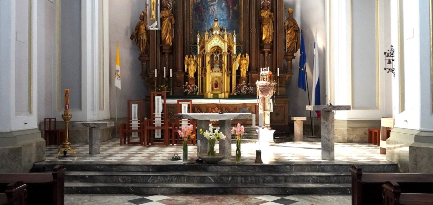 Prezbiterij in apsida sta dvignjena nad cerkveno ladjo in dostopna po treh temnih kamnitih stopnicah. Na stopnicah so običajno trije svečniki(1), okrašeni s shematičnimi podobami vernikov – od živih do mrtvih (Drago Tršar, 1999). V skladu s sodobno cerkveno liturgijo je na osi prezbiterija kamnita daritvena miza (2), ki stoji na štirih nogah, umeščenih na belih ploščah. Desno od nje je minimalistični ambon(3), levo pa krstilnik (Motoh, 1999) (4). Vsi trije elementi spominjajo na kropilnike v preddverju. Ti elementi so namenjeni obredom in oznanjanju božje besede. Ob mizi je še kamnita posoda za cvetje(5), skladna s krožno zasnovo cerkve.