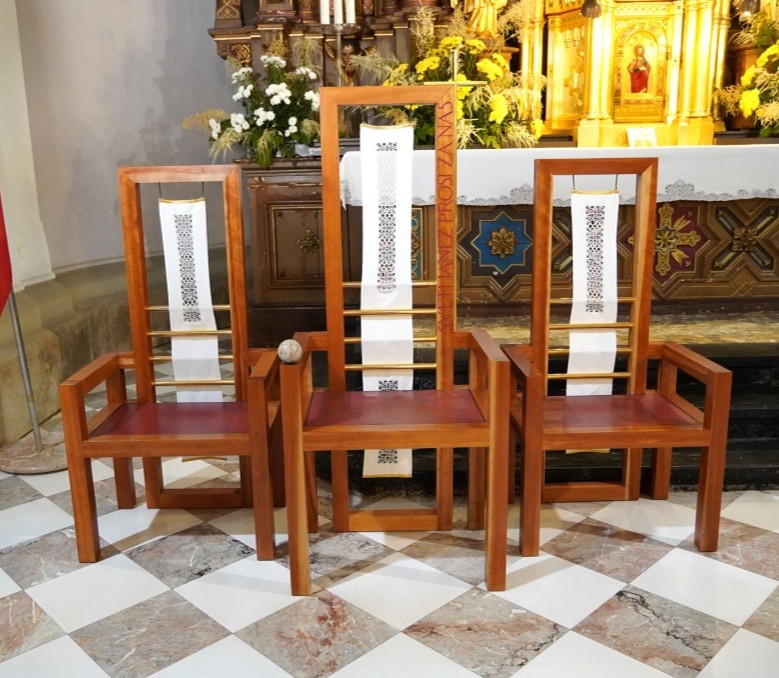 Za prvo linijo so na levi strani tri sedilije (7), srednja je višja. Prekrite so z belo laneno vezenino iz idrijskih čipk (Janez Suhadolc, 1999), sedala pa so oblazinjena v rdeči barvi. Osrednji “prestol” izhaja iz osnutka za sedež ob papeževem obisku.