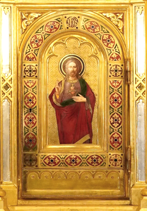 Na vratih tabernaklja je upodobljen Kristus, ki blagoslavlja.