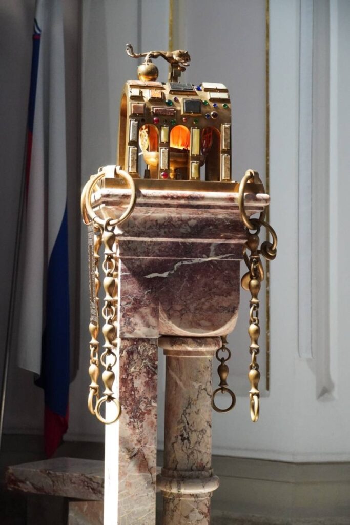 Kamnita krogla na naslonu za roko simbolizira Zemljo, medeninast križ pa duhovnika, ki združuje svet in križ.
