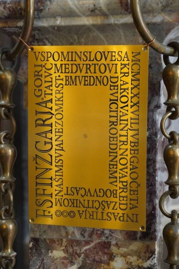 “V spomin slovesa MCMXXXVI ljubega očeta in pastirja F. S. Finžgarja gori ta luč med vrtovi Krakova in Trnovega pred zaščitnikom našim Janezom Krstnikom in BM vedno Devici troedinemu Bogu v čast.“